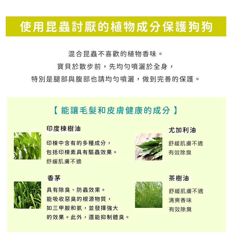 外出漫步前,均勻噴灑於全身(避免噴至眼睛)即可