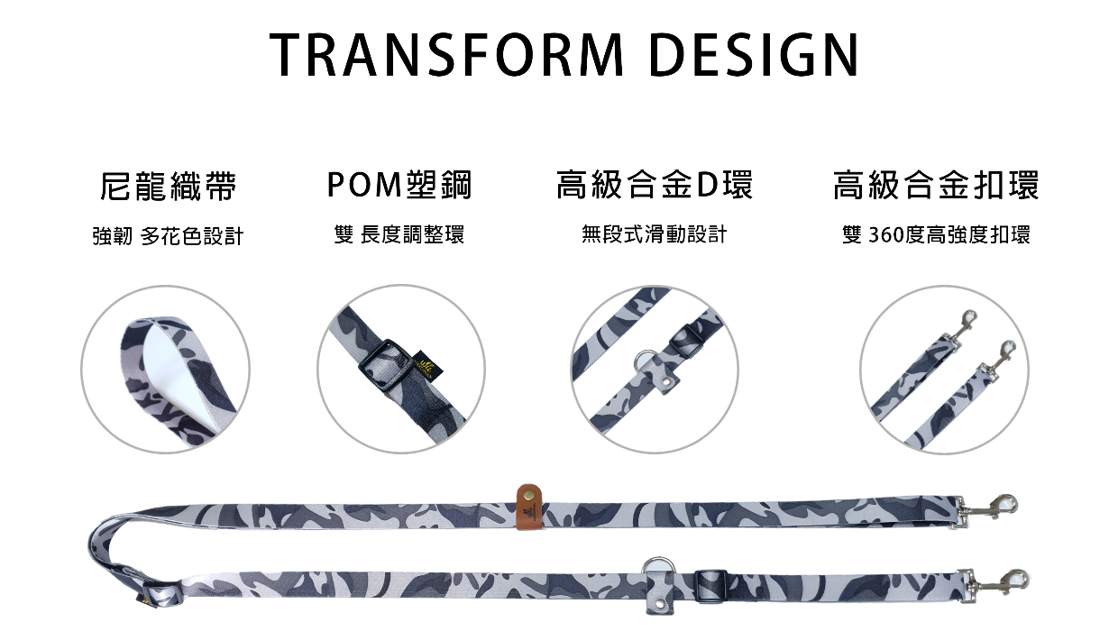 台灣戶外寵物用品AUSKOMMEN 變形牽繩 黑灰迷彩