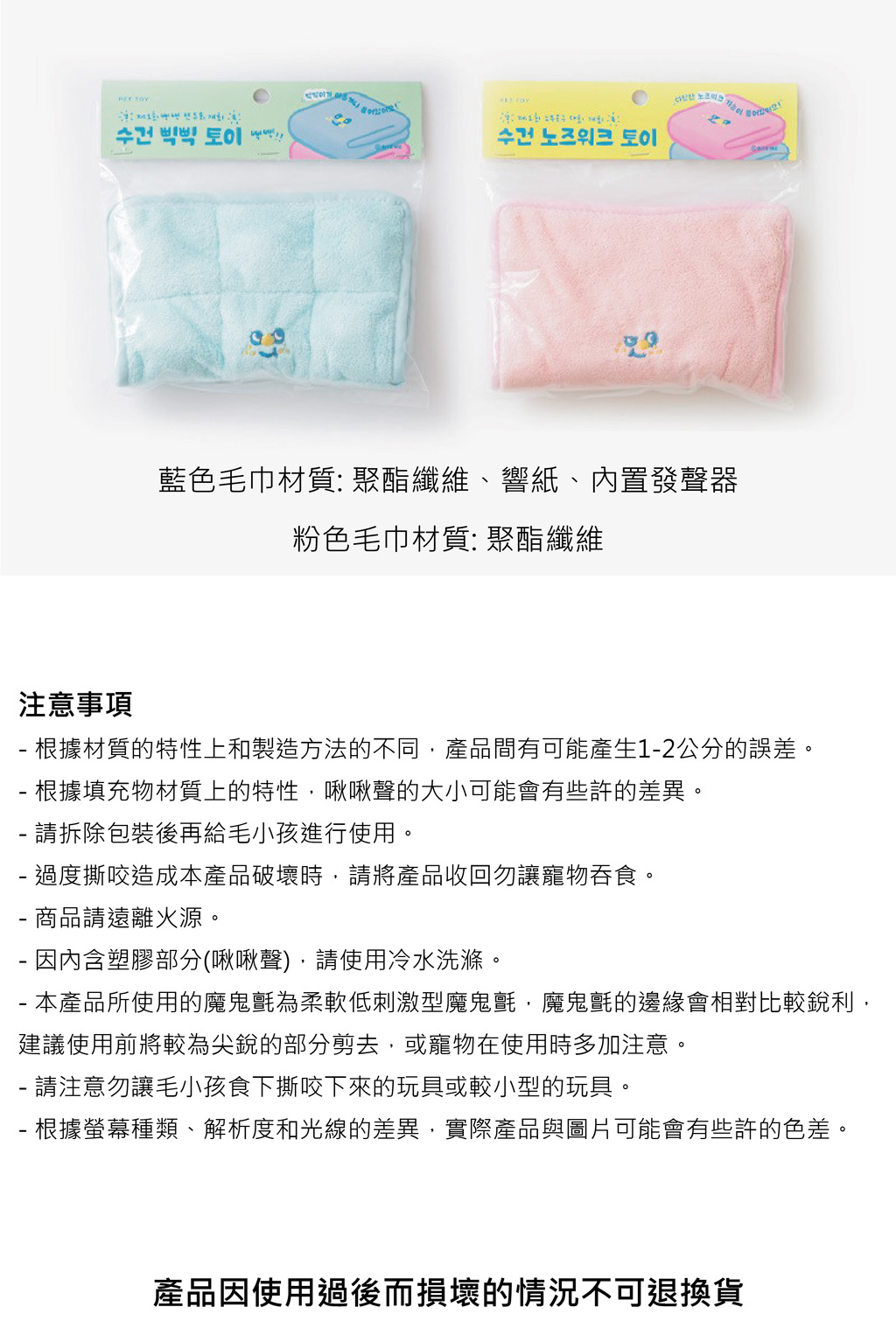 ►材質:藍色毛巾:聚酯纖維、響紙、內置發聲器
