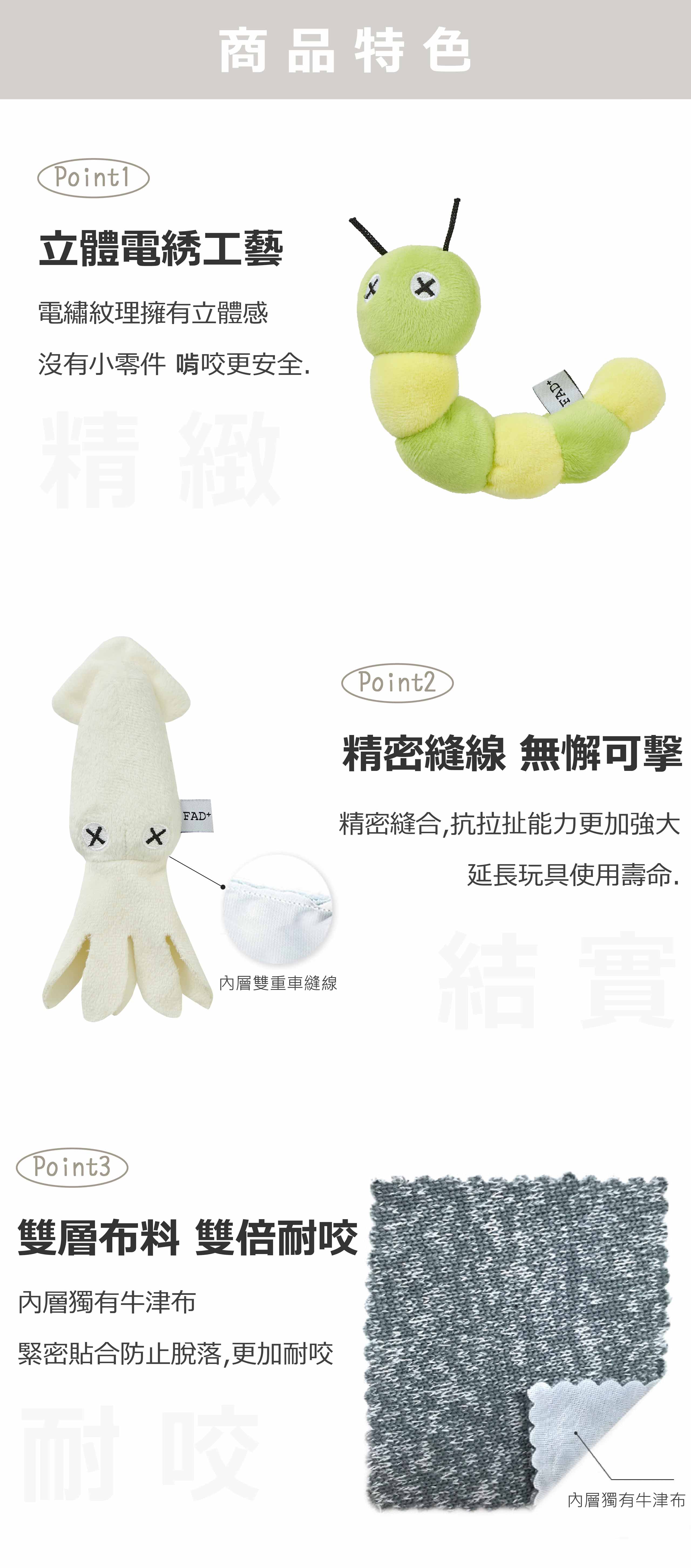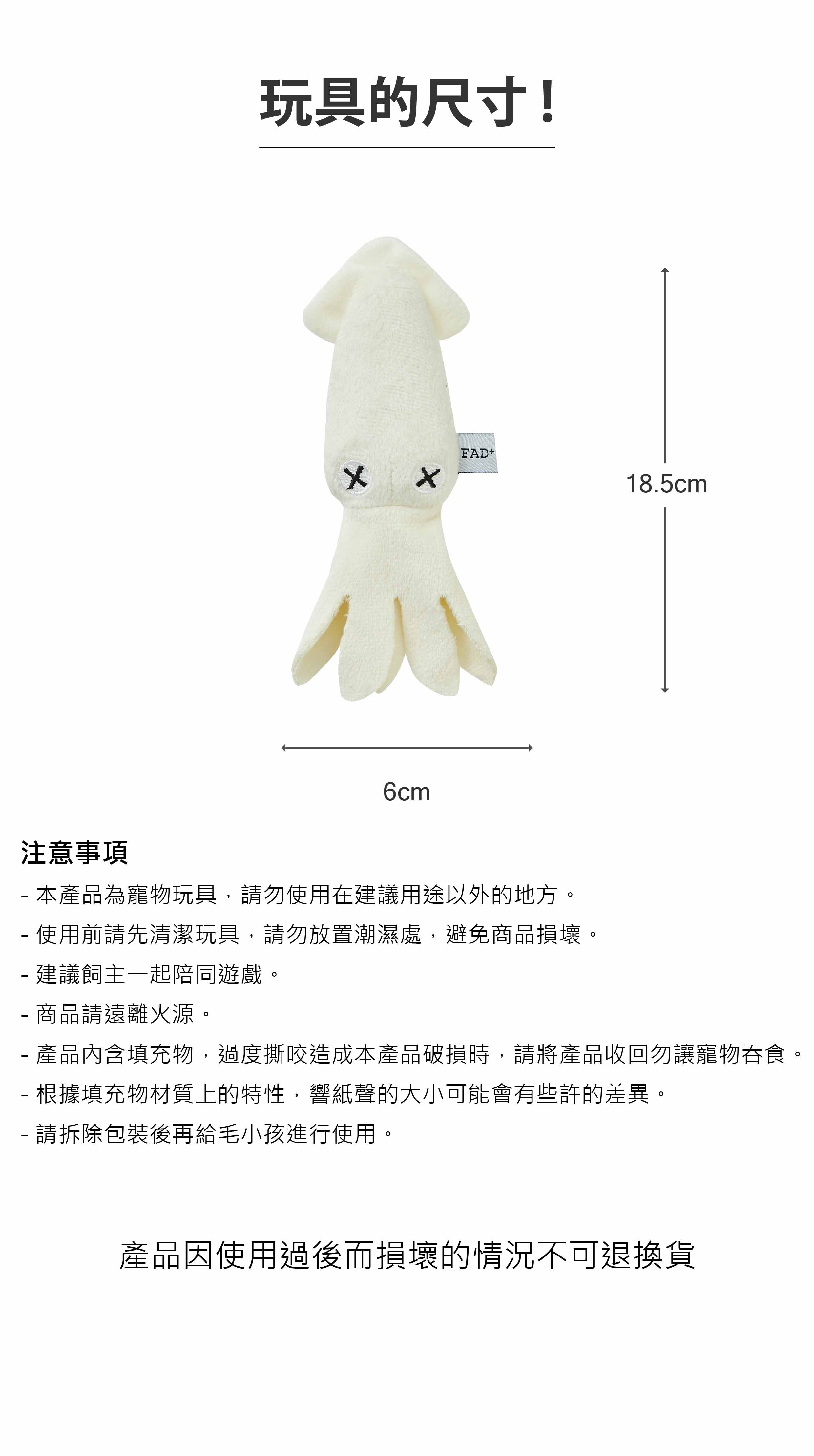 - 建議飼主一起陪同遊戲。 - 商品請遠離火源。 - 產品內含填充物,過度撕咬造成本產品破損時,請將產品收回勿讓寵物吞食