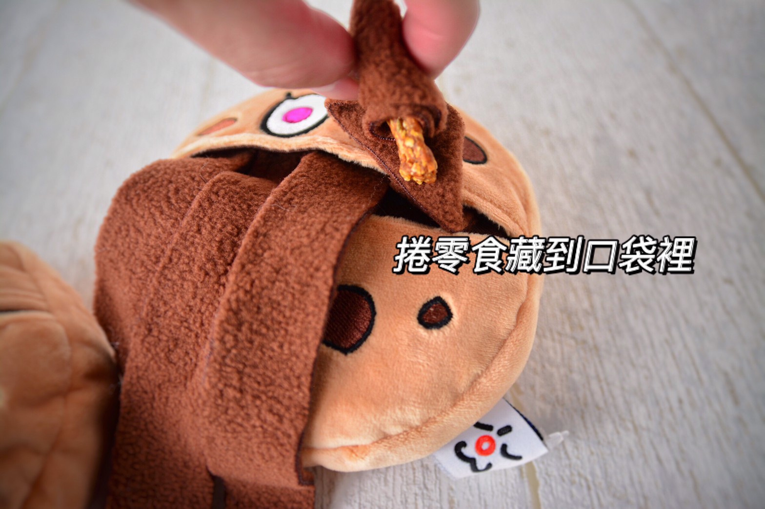 ▲餅乾嘴巴可拉出很多條藏食布條,可以將零食捲進布條中讓毛寶貝嗅聞,嗅聞老手則可以再將捲了零食的布條塞進餅乾嘴巴中,增加嗅聞的困難度