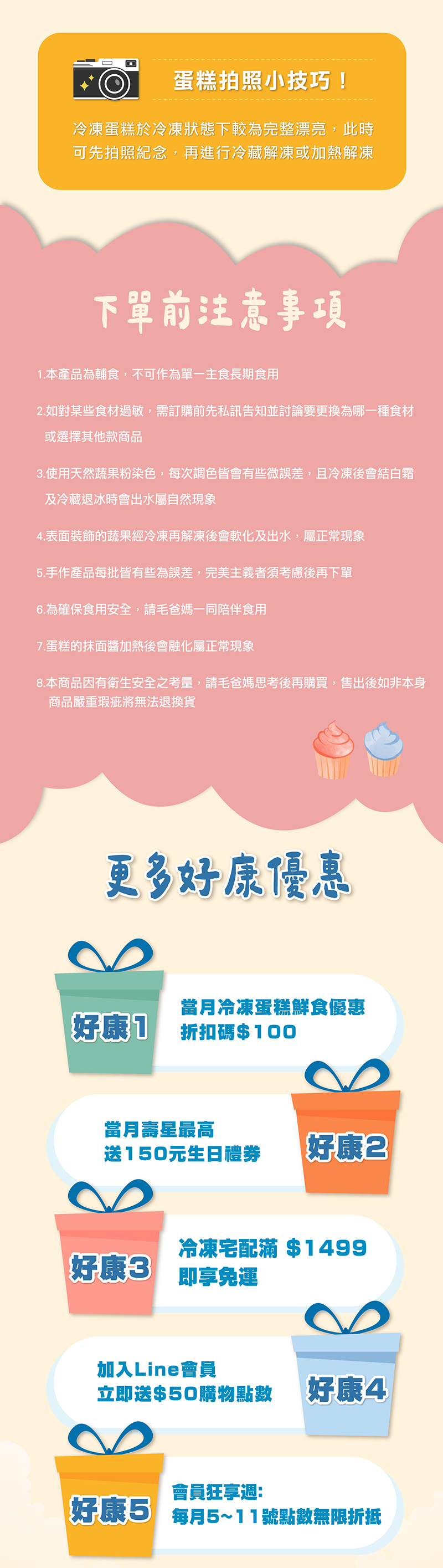 3.預購時間:本款產品屬下單付款後開始安排製作,請至少提早七天前預訂(如遇提早滿單將提早截止接單),讓我們可以採買新鮮食材製作蛋糕,如需急單請訂購前先詢問是否有足夠食材可製作