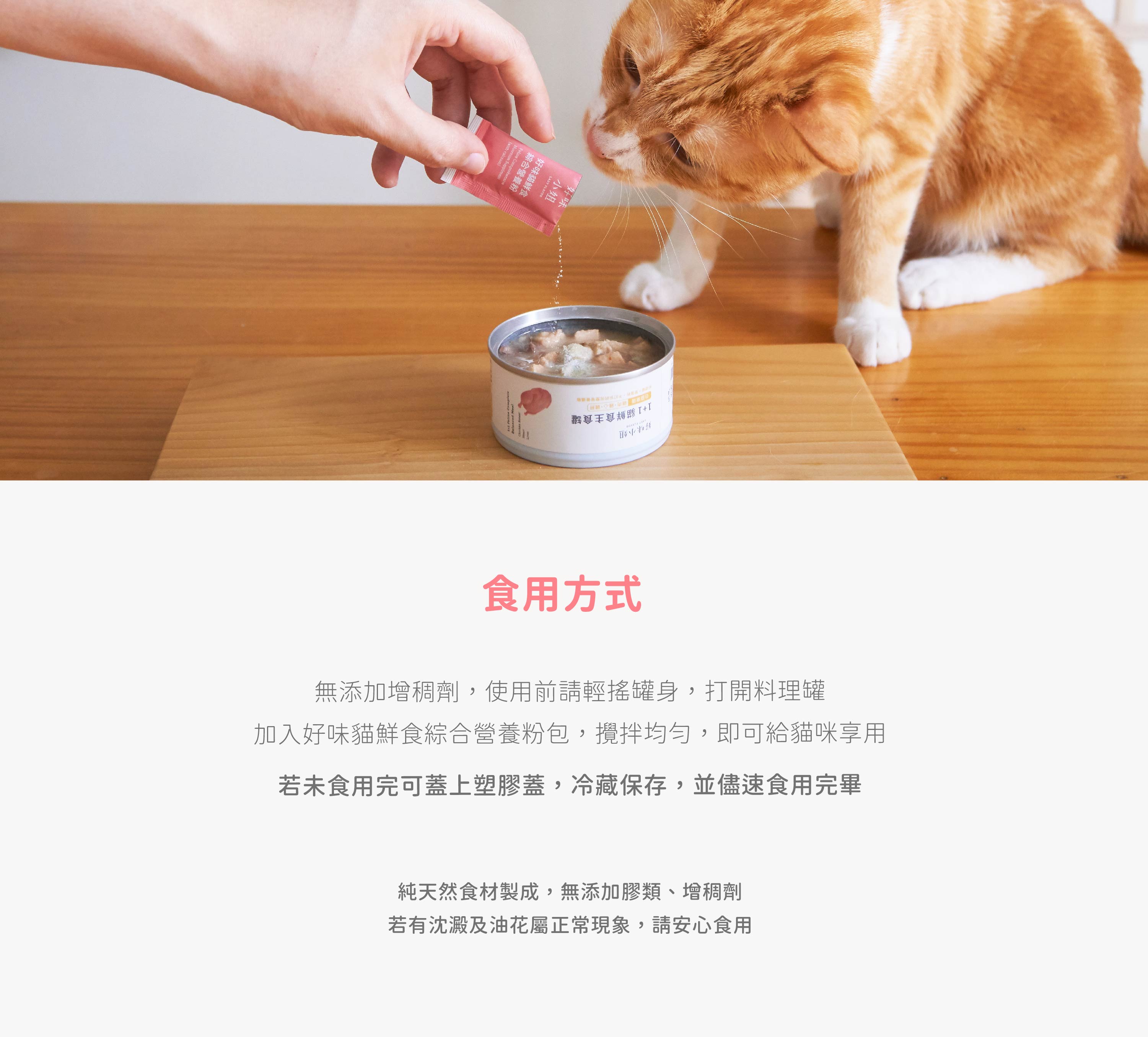 1.慢燉鮮魚料理罐成分:台灣好漁生食級鯛魚片、台灣洽富氣冷雞胸肉、挪威美威生鮮鮭魚輪切片、水、雞心、雞肝、芥花油、白木耳、馬鈴薯、貓用羊奶粉、洋車前子、小茴香