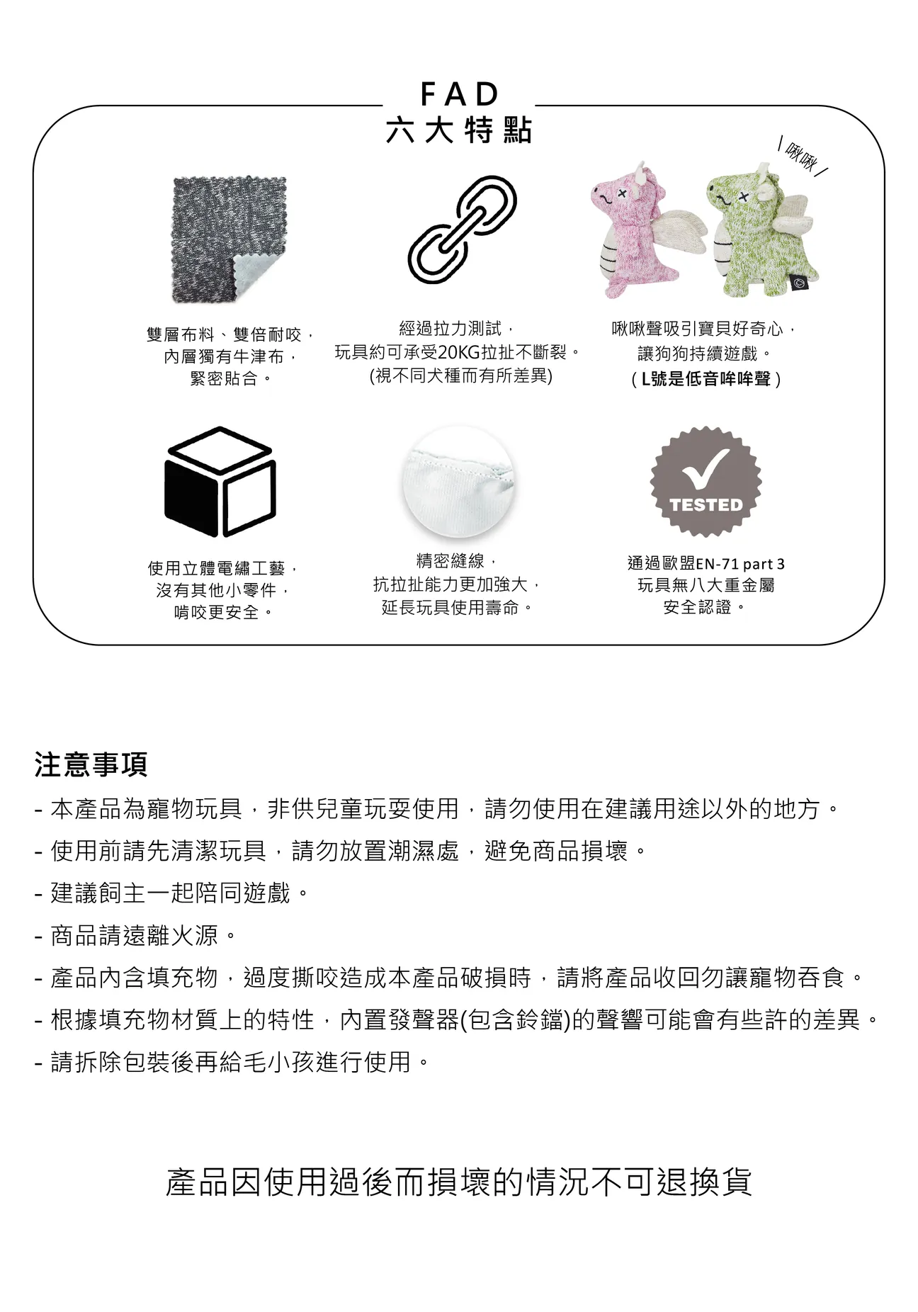 | 注意 事項 | - 本產品為寵物玩具,非供兒童玩耍使用,請勿使用在建議用途以外的地方。 - 使用前請先清潔玩具,請勿放置潮濕處,避免商品損壞。 - 建議飼主一起陪同遊戲。 - 商品請遠離火源。 - 產品內含填充物,過度撕咬造成本產品破損時,請將產品收回勿讓寵物吞食。 - 根據填充物材質上的特性,啾啾聲的大小可能會有些許的差異。 - 請拆除包裝後再給毛小孩進行使用。 |