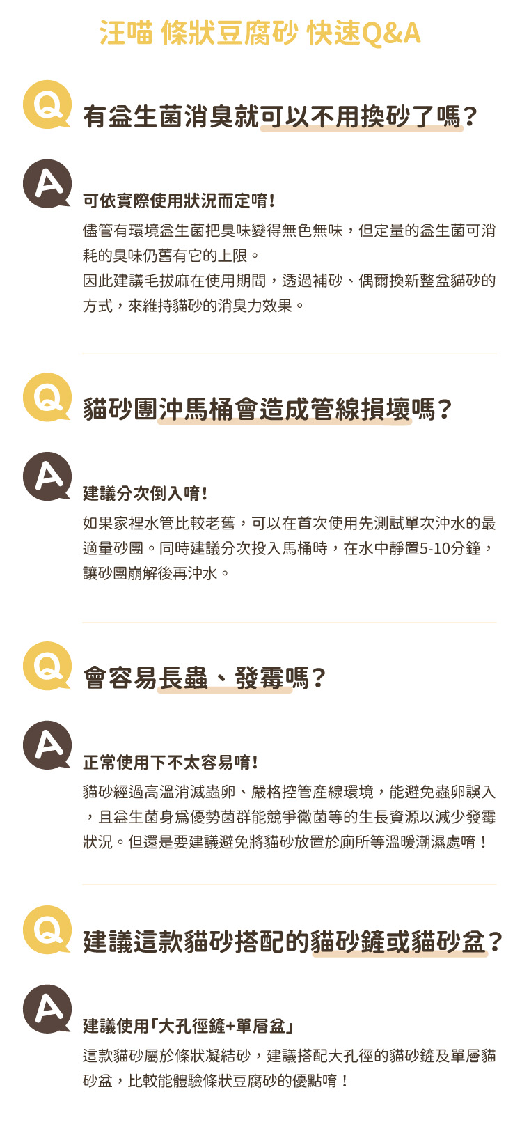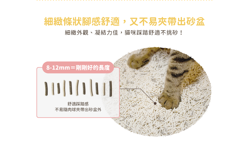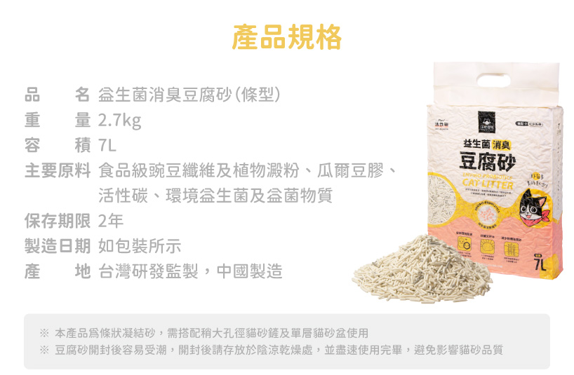 ※ 本產品為條型凝結砂,需搭配稍大孔徑貓砂鏟及單層貓砂盆使用。