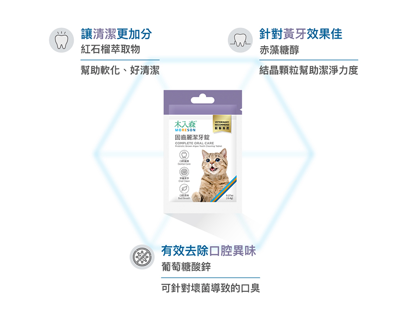 木入森《貓固齒麗潔牙錠》,有別於傳統貓咪潔牙方式,不用接觸牙齒也有效。