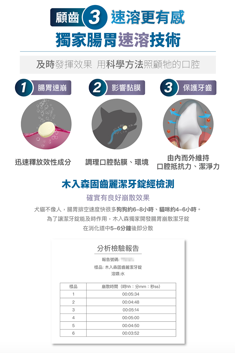 因此為了讓潔牙錠能「及時與充分」在腸胃釋放營養、發揮功效 ,使用獨家腸胃崩散專業技術製作潔牙錠,在消化道中「5-6分鐘」後即分散。