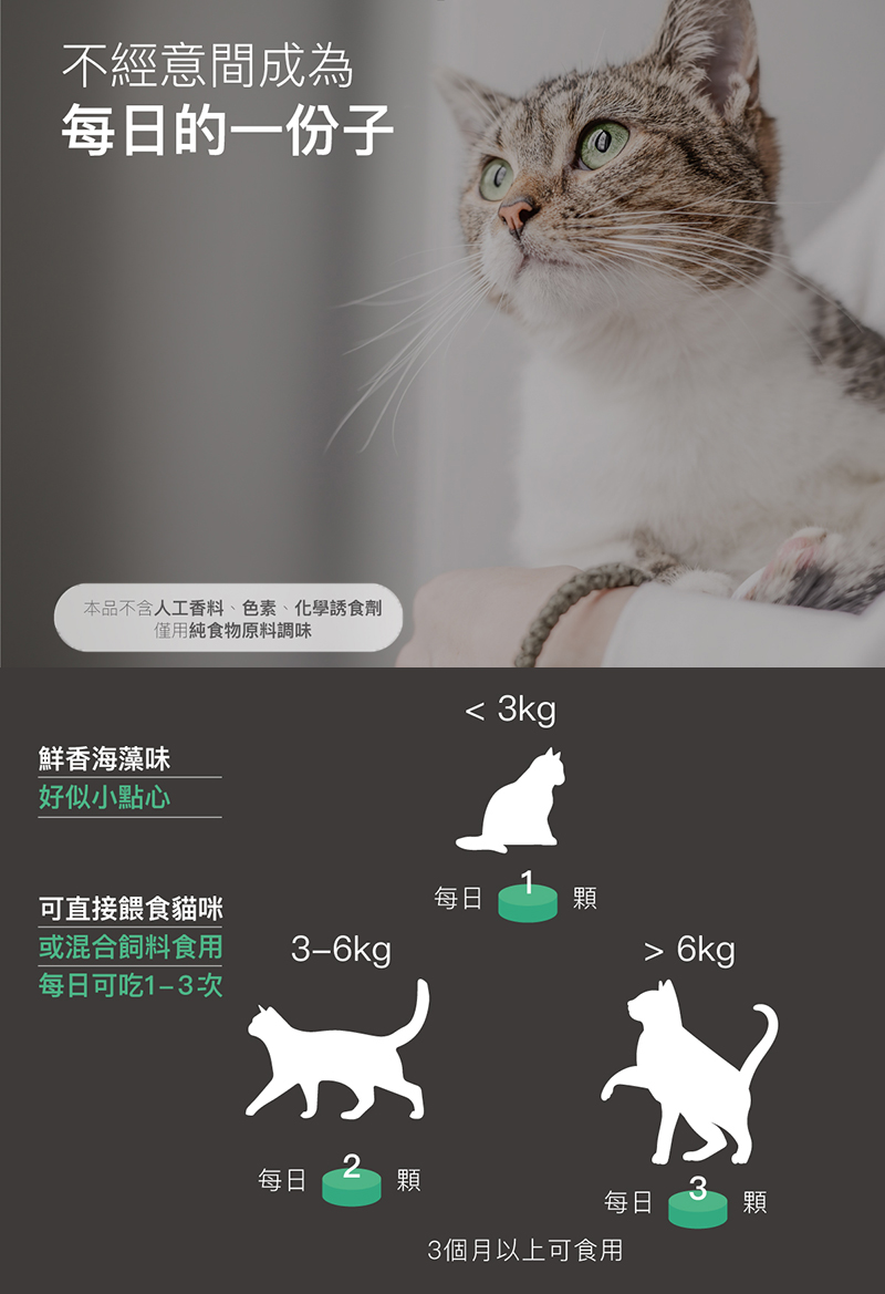 【使用方式】每日可用1-3次,可直接給貓咪使用或拌入食物中給予。