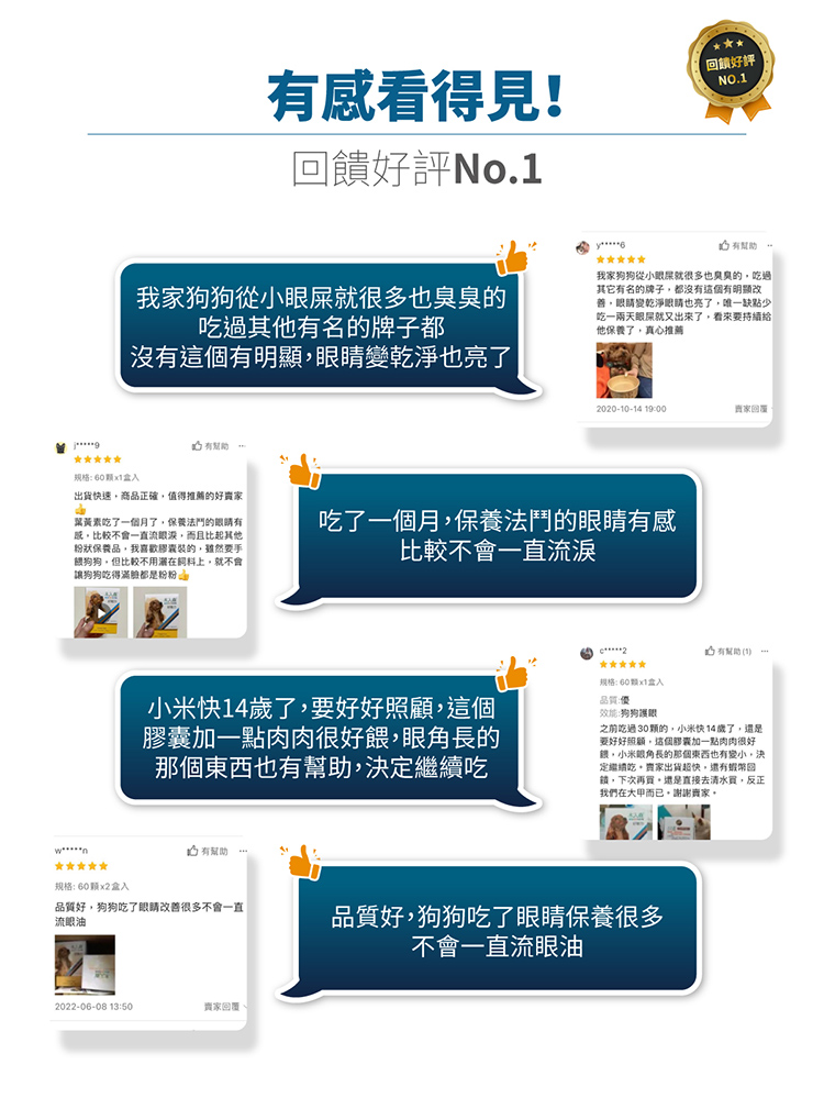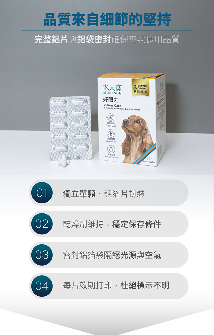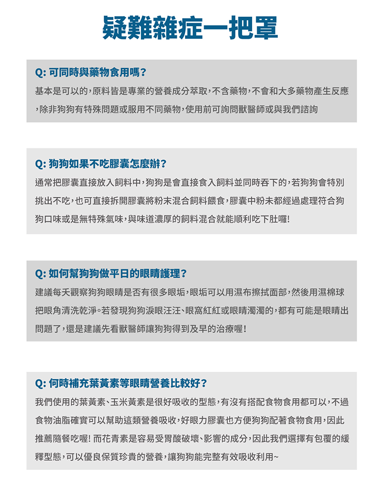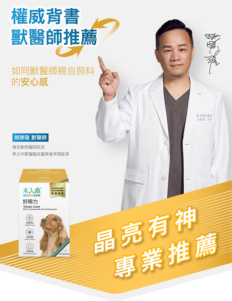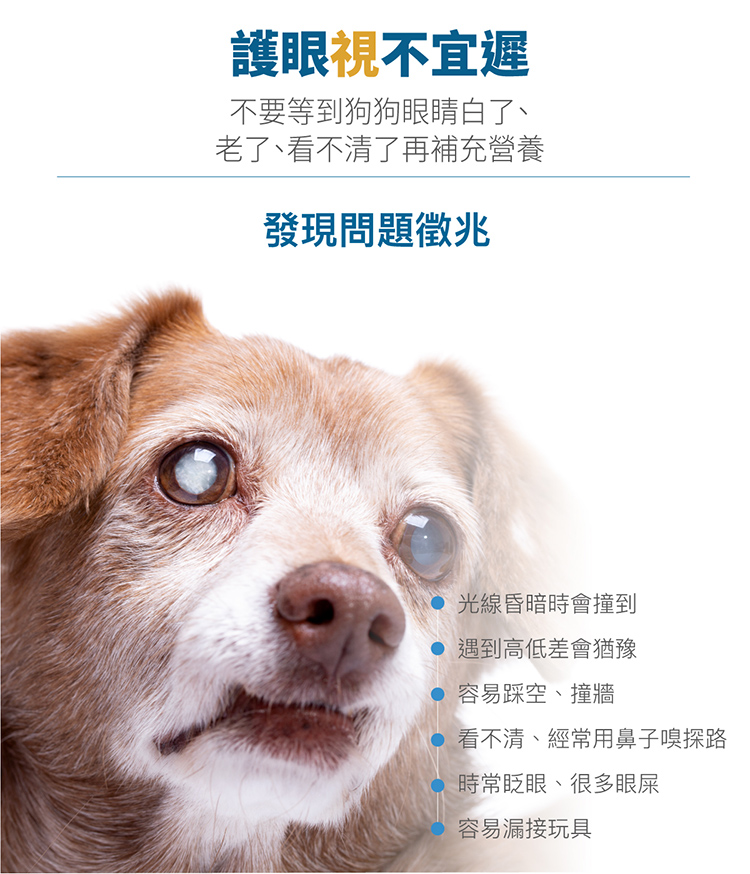 可作為「好發犬種」與「老年狗狗」的營養補充以及「眼睛不適」狗狗的護理營養。