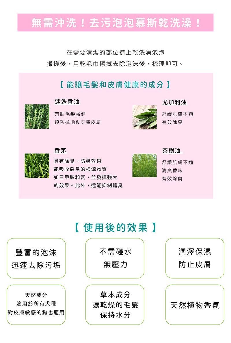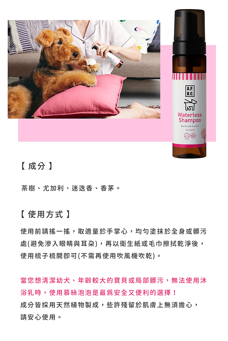 取適量於手掌心,雙手搓揉均勻後塗抹於全身再輕輕搓揉(避免滲入眼睛與耳朵),再以乾淨的乾毛巾擦拭乾淨後,自然風乾即可。如需局部清潔,可搭配APDC的有機棉布做局部清潔及擦拭