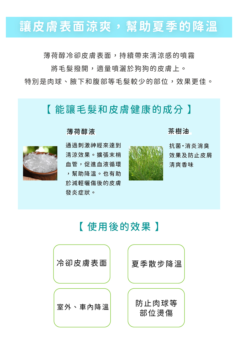 使用時,可直接噴灑於皮膚、四肢、肉球、腹部,效果最佳
