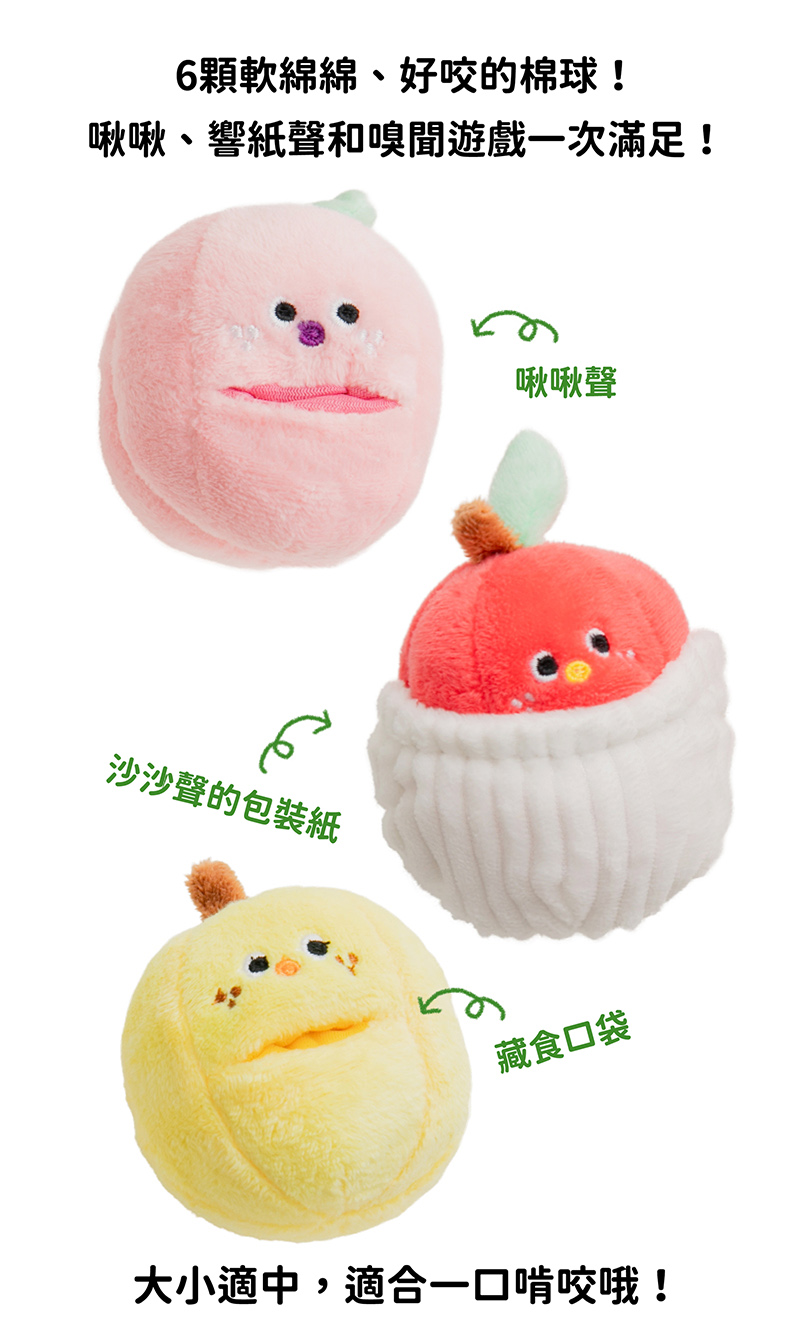 水果禮盒中有成熟的梨子、桃子和蘋果,6顆軟綿綿、好咬的棉球!