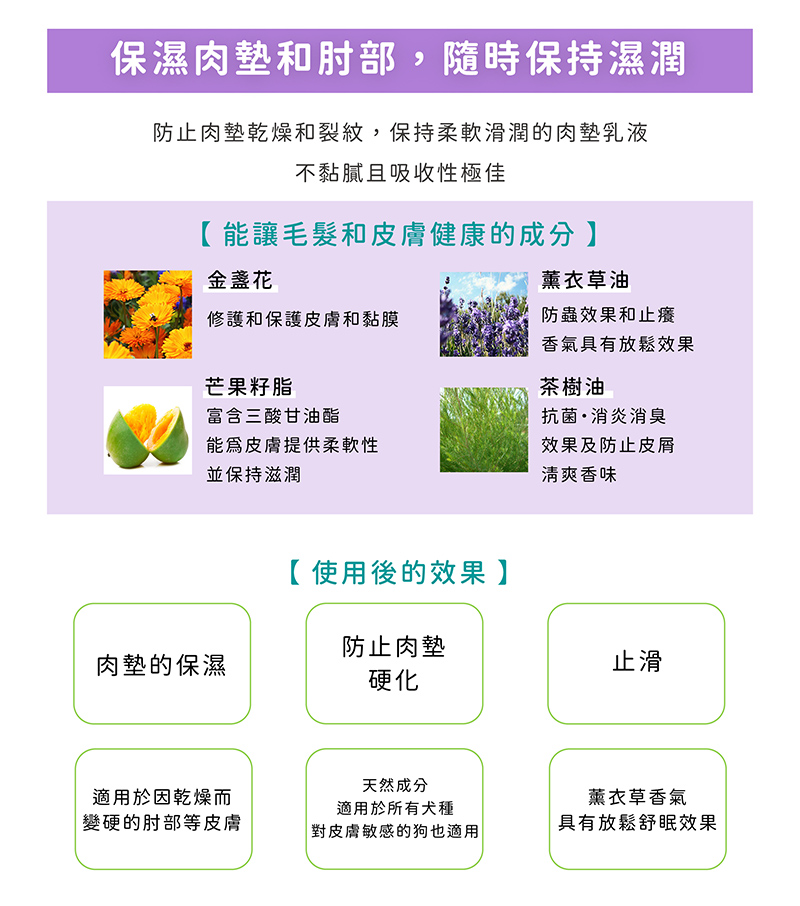 溫和滋潤保濕肉球和肘部,保濕、保水、保持舒適感,溫和不傷肌膚,所以腹部等毛薄的地方也推薦使用。