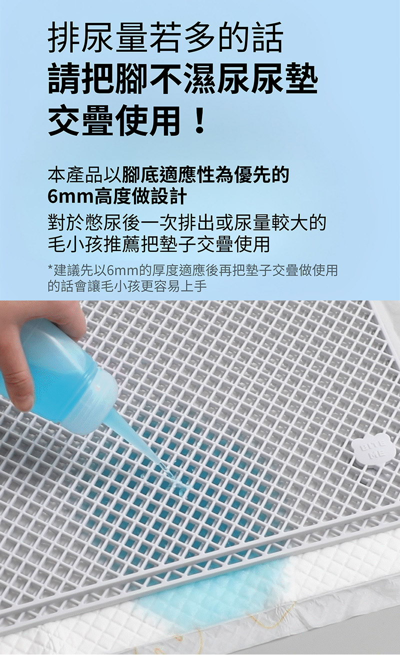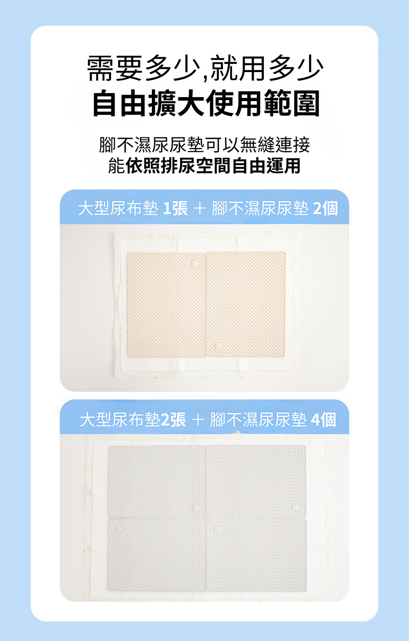 **可自由拼接擴大範圍,若家中寶貝尿量大 可重疊兩層腳不濕尿尿墊使用**