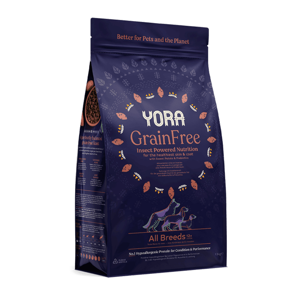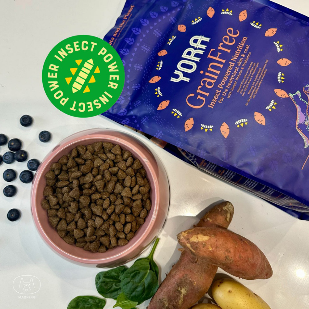 黑水虻幼蟲41.5%(昆蟲粉28%,新鮮昆蟲8%,昆蟲油5.5%)、地瓜(23%)、馬鈴薯(20%)、甜菜渣(5%)、礦物質、蔬菜高湯、亞麻籽、啤酒酵母、海藻粉(0.5%)、菊苣根萃取物(益生元FOS的來源)(0.1%)、軟骨素(500毫克/公斤)、脫水菠菜(0.05%)、脫水藍莓(0.05%)、脫水胡蘿蔔、脫水蕁麻、脫水歐芹、脫水迷迭香、薑黃(0.005%)、脫水綠薄荷。