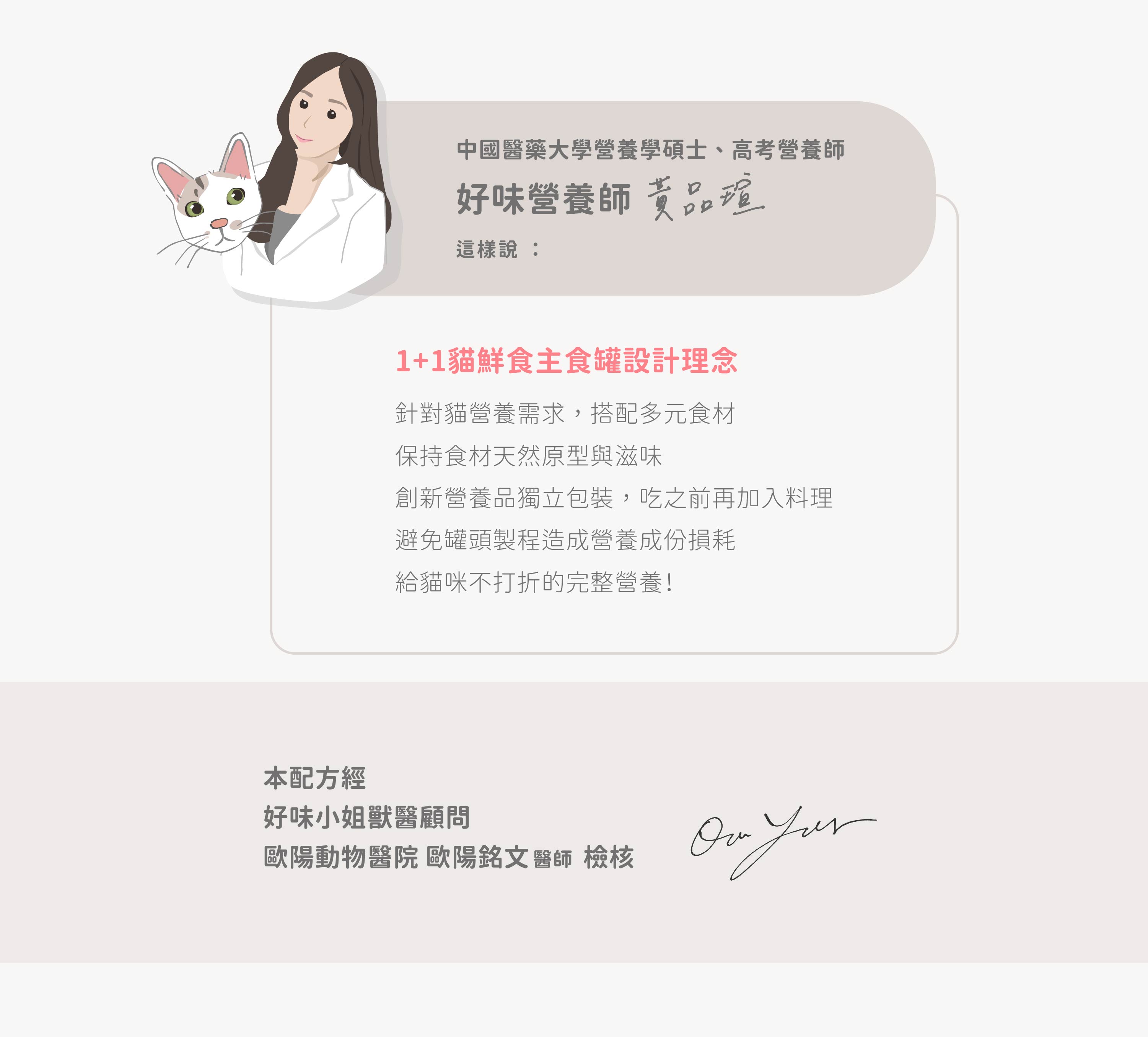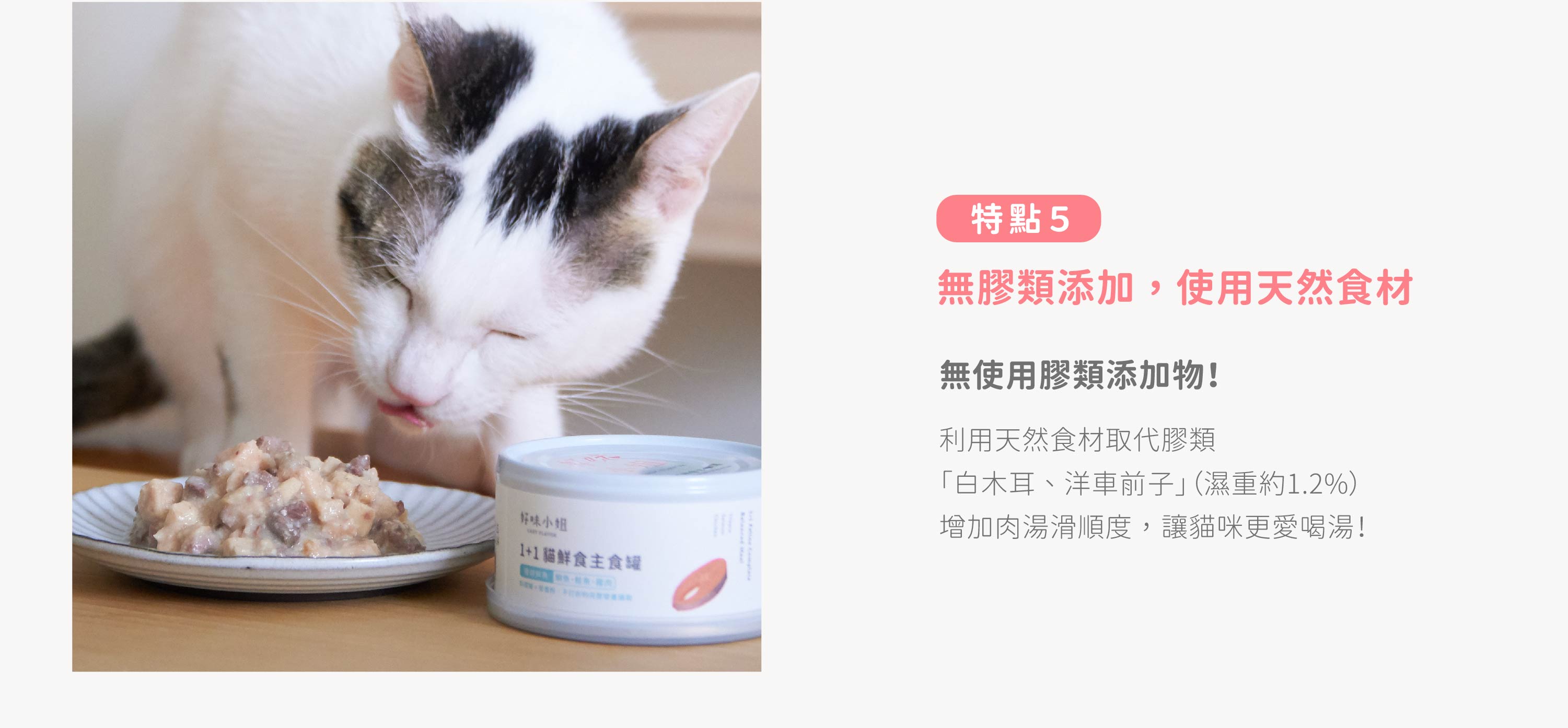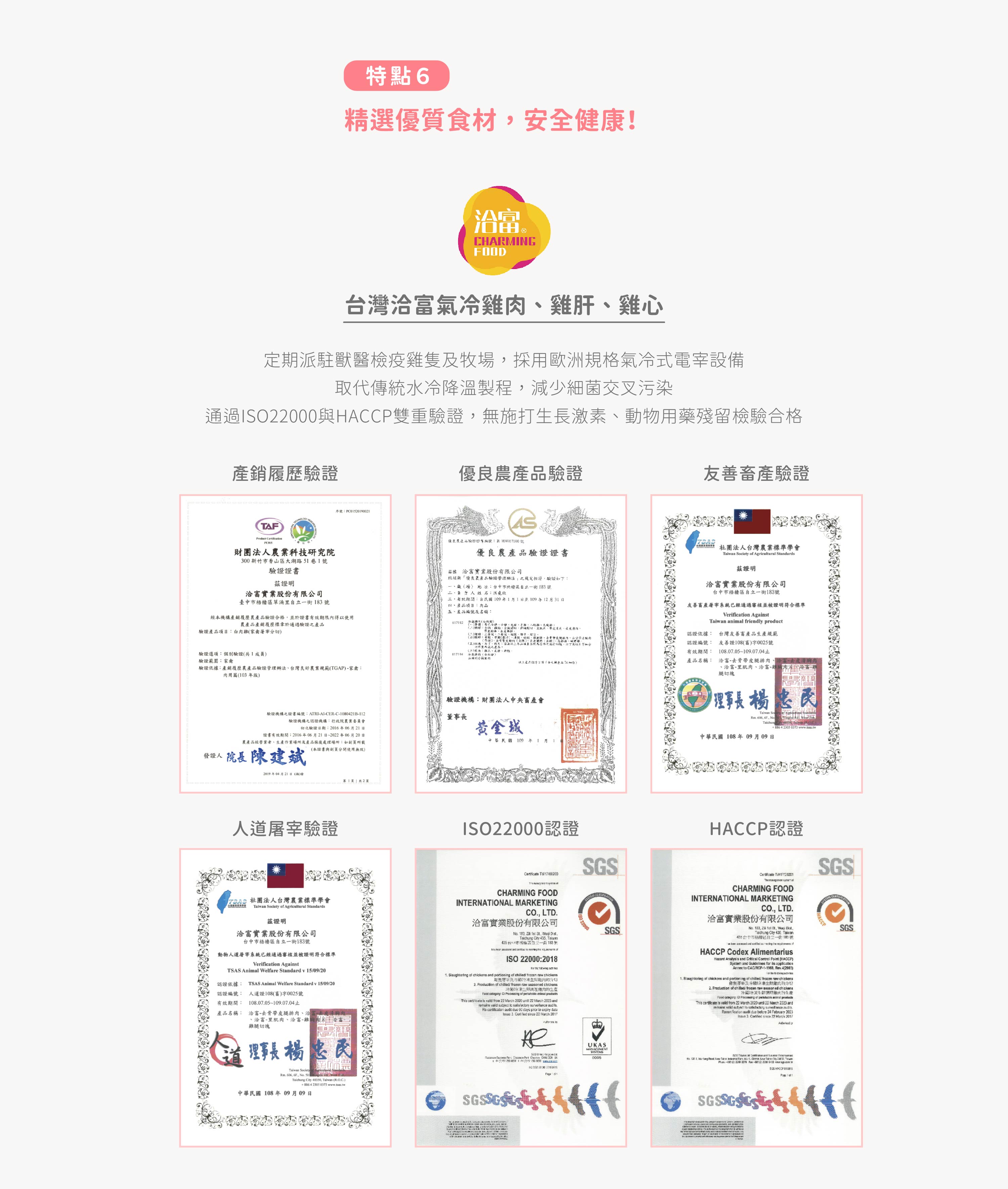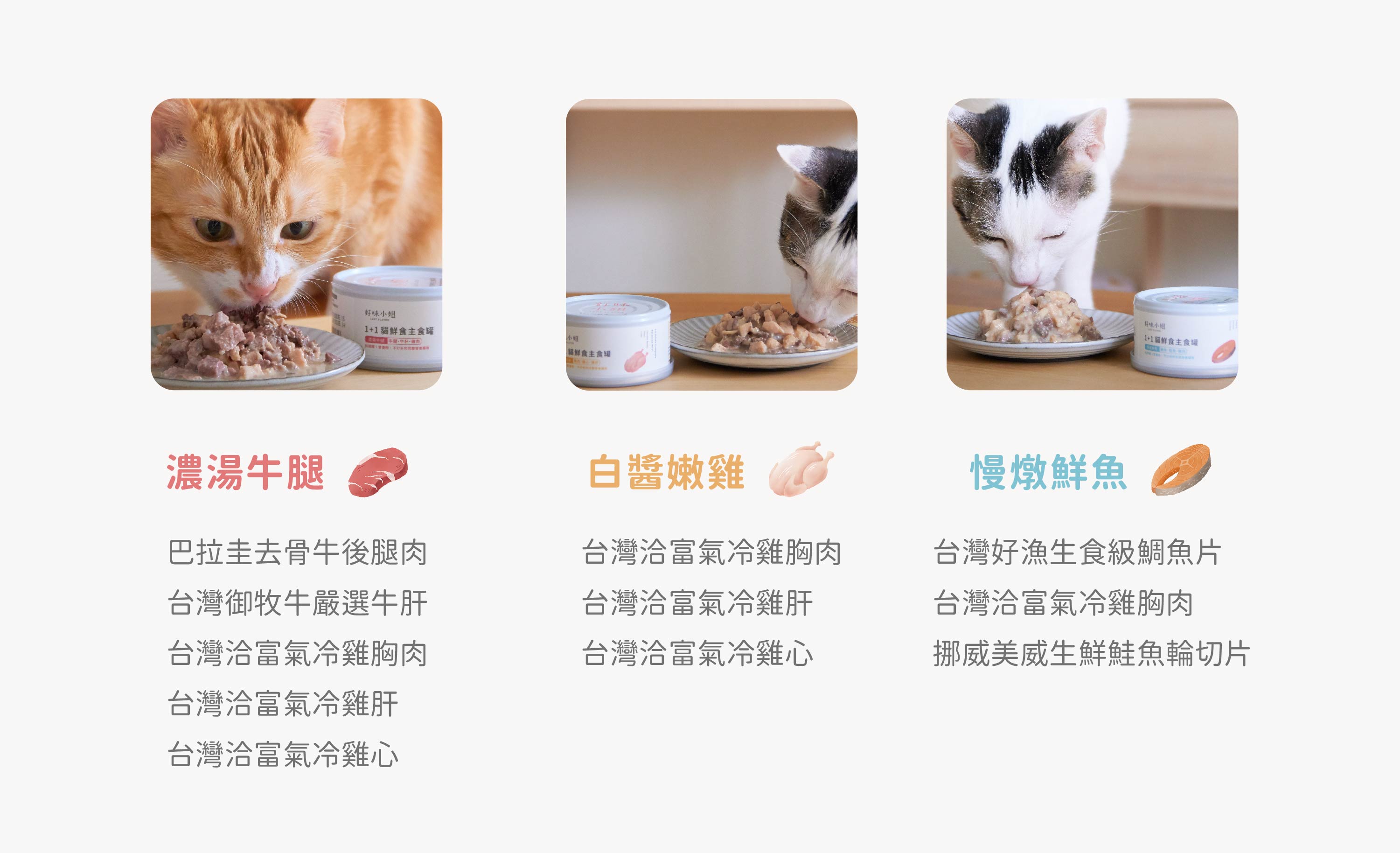 1.慢燉鮮魚料理罐成分:台灣好漁生食級鯛魚片、台灣洽富氣冷雞胸肉、挪威美威生鮮鮭魚輪切片、水、雞心、雞肝、芥花油、白木耳、馬鈴薯、貓用羊奶粉、洋車前子、小茴香
