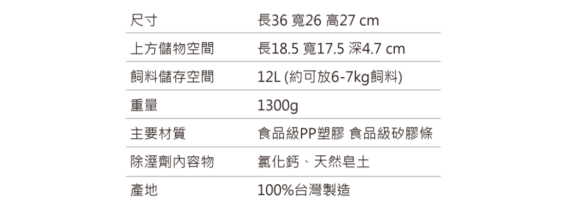 飼料儲存空間:12L (約可放5-6kg飼料)