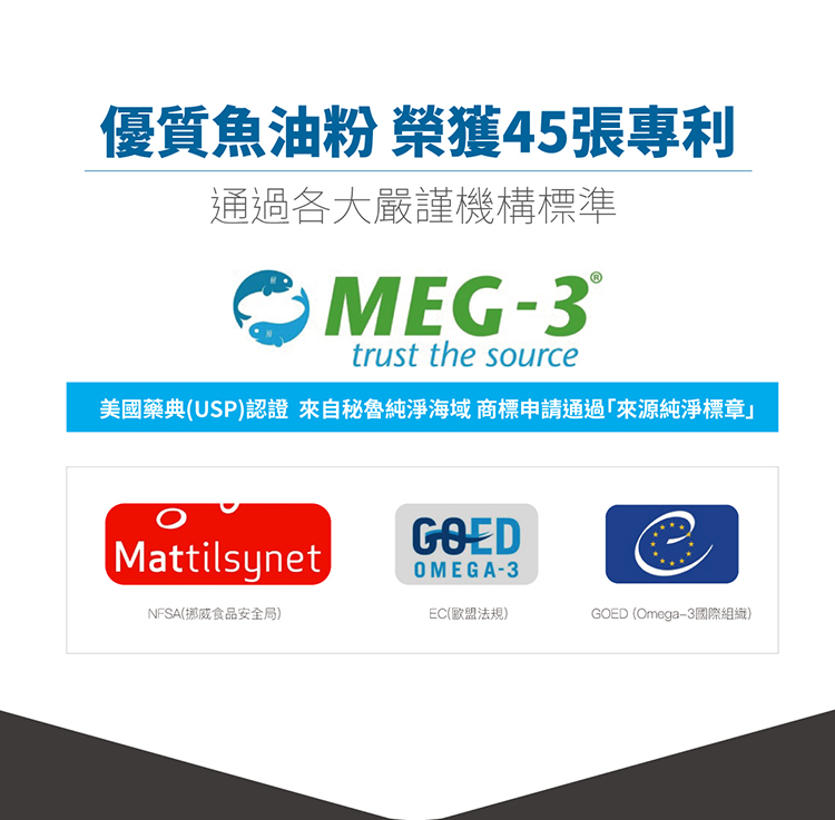 | 主成份 | 專利雙層包覆魚油粉(精製魚油、魚膠、維生素C、維生素E、葵花籽油、檸檬酸) |