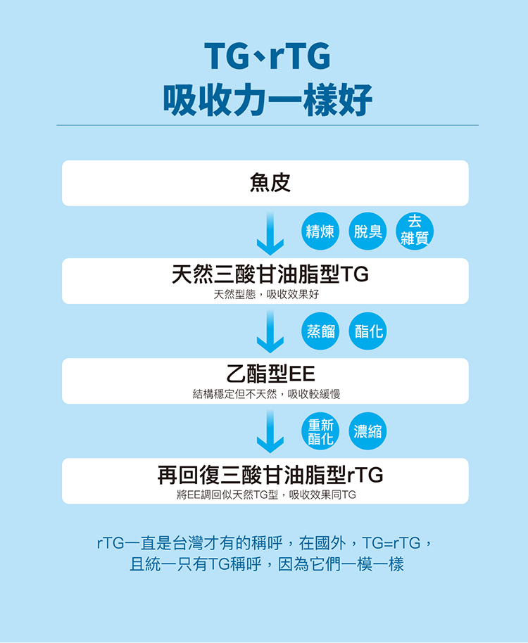 經研究發現補充 TG/rTG 或 EE 型態油脂,0~24 小時後,血中 EPA+DHA 含量差異,證明 TG/rTG 型態,短時間有較好的吸收率!
