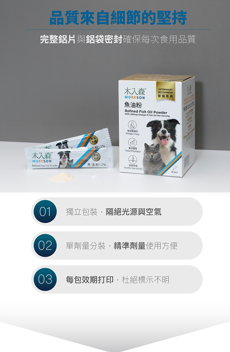 魚油粉比魚油更適合毛孩的 omega-3 營養來源,除了餵食方面超方便,也不易與其他成分發生反應變質,腥味也更低,挑食的狗狗貓咪的接受度更高,還能完整新鮮封存魚油的營養。
