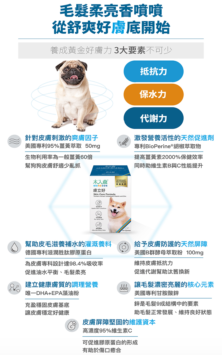 木入森犬寶膚立好,打造狗狗皮膚保健層層防護網。全方位營養搭配,調節皮脂分泌與皮膚乾燥,皮膚過敏舒緩,減輕搔癢等皮膚刺激,維持皮膚正常功能。