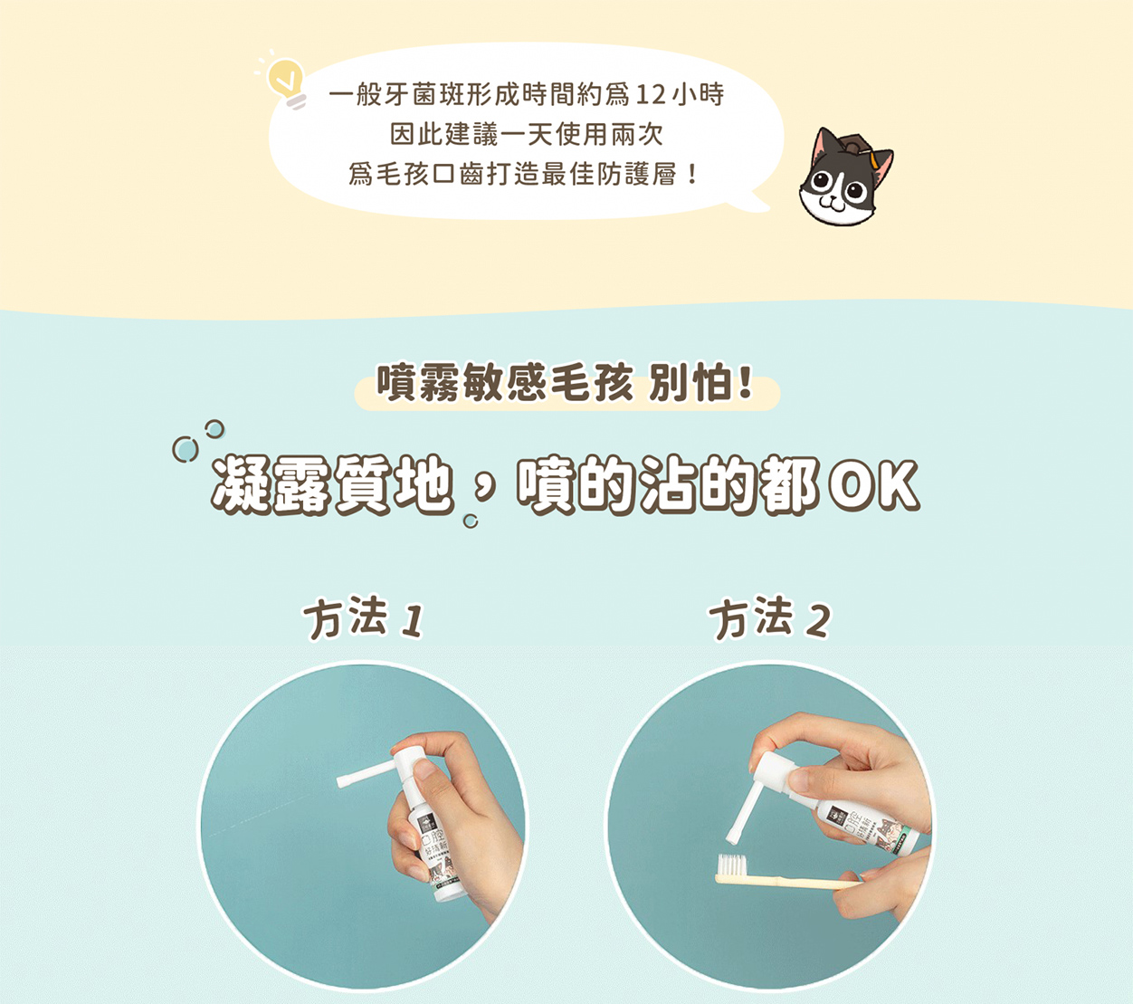 ✔噴灑在食物、飲水中 ✔直接噴於犬貓牙齦兩側 ✔搭配牙刷使用
