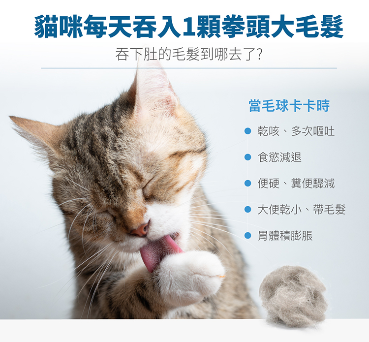 | 食用方式 | 日常排毛保養:2~3 天一次 換毛或吐毛時:可天天使用 可投入飼料中,混合飼料吃 |