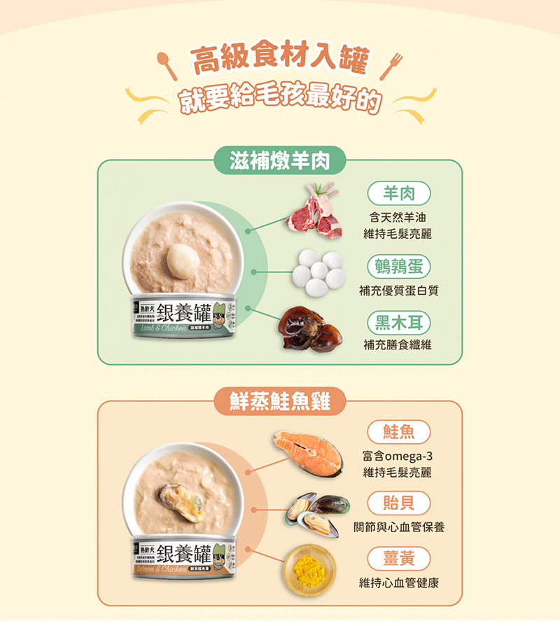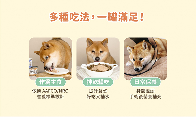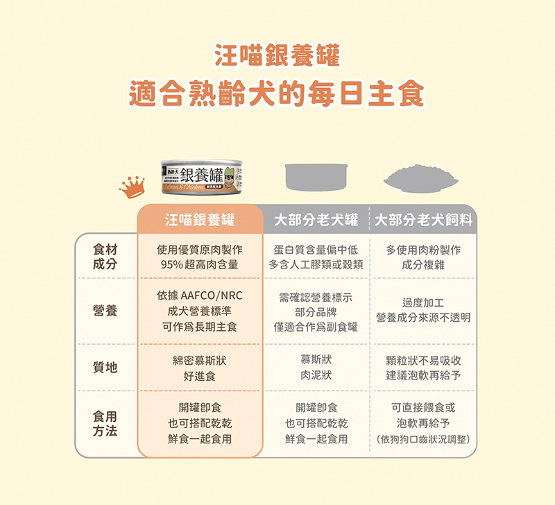 可以!汪喵熟齡犬銀養主食罐依據美國AAFCO/NRC 成犬營養標準設計,可作為一歲以上成犬每日主食,也推薦搭配汪喵犬用95%鮮肉主食罐食用,多方攝取營養哦!