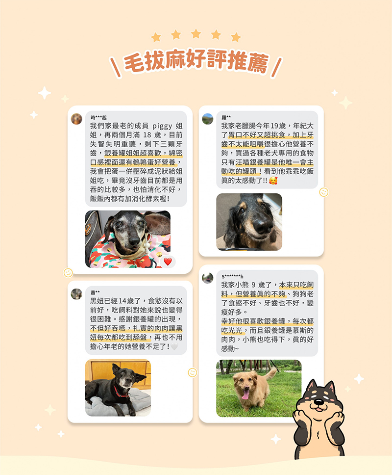 基本上熟齡犬銀養主食罐已經含有足夠熟齡犬每日所需營養,不需額外補充營養品,但若熟齡毛孩有特定想加強保養的部位,毛拔麻可以視情況搭配補充其他保養品。