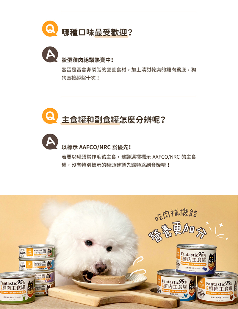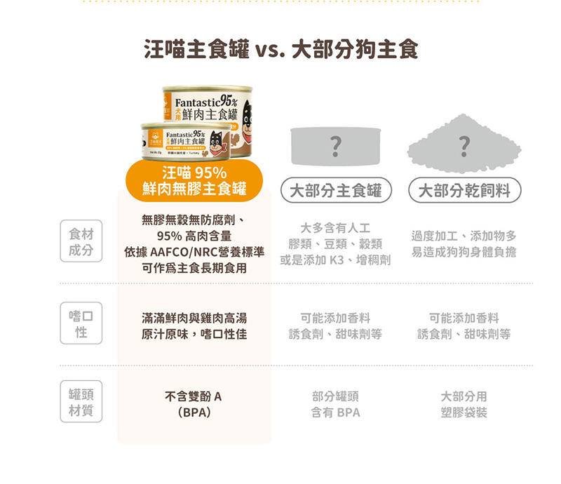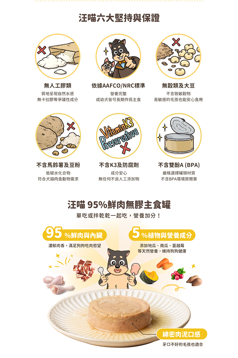 汪喵主食罐含肉量非常高(95%),無添加爭議膠類、大豆薯粉等添加物,因此適口性特別好;