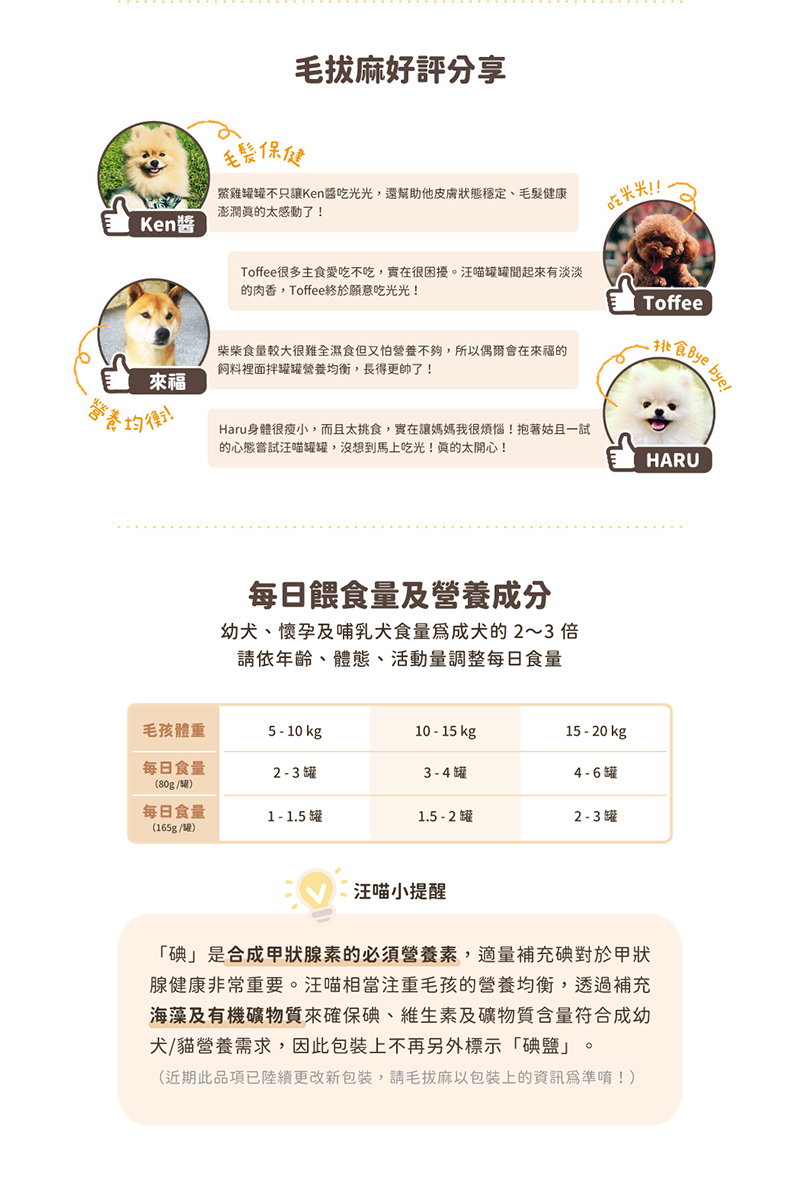 • 幼犬、懷孕及哺乳犬的食量為成犬食量的2~3倍