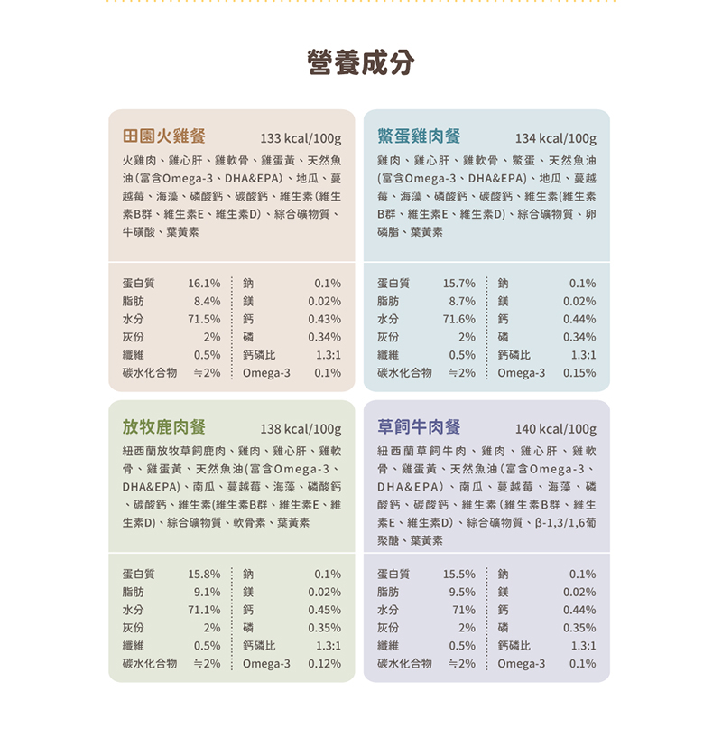 • 95%鮮肉及內臟+5%植物與必需營養素