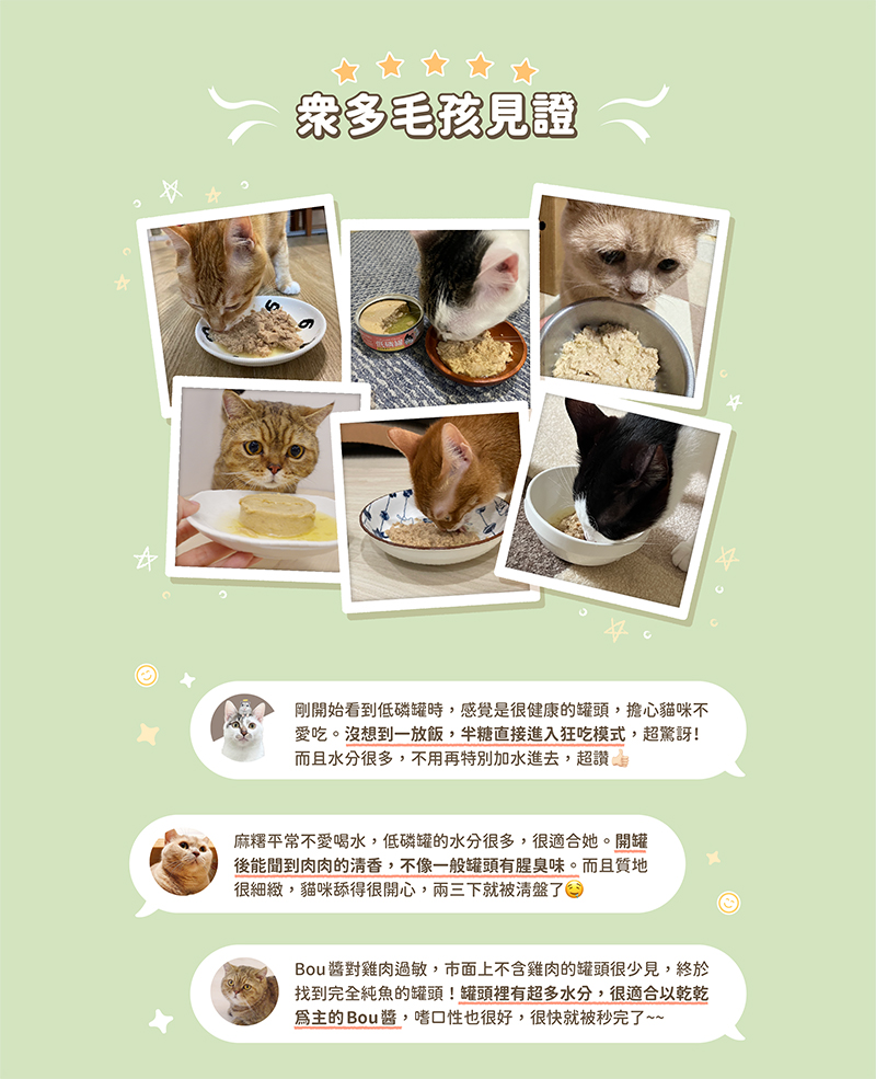 與腎臟困擾貓咪相比,健康成貓在飲食上較無限制,也推薦吃汪喵其他款「減磷,不到低磷」的無膠主食罐,如鮮肉罐、挑嘴罐等。輪流搭配著吃,可以讓貓咪換換口味、維持新鮮感唷!