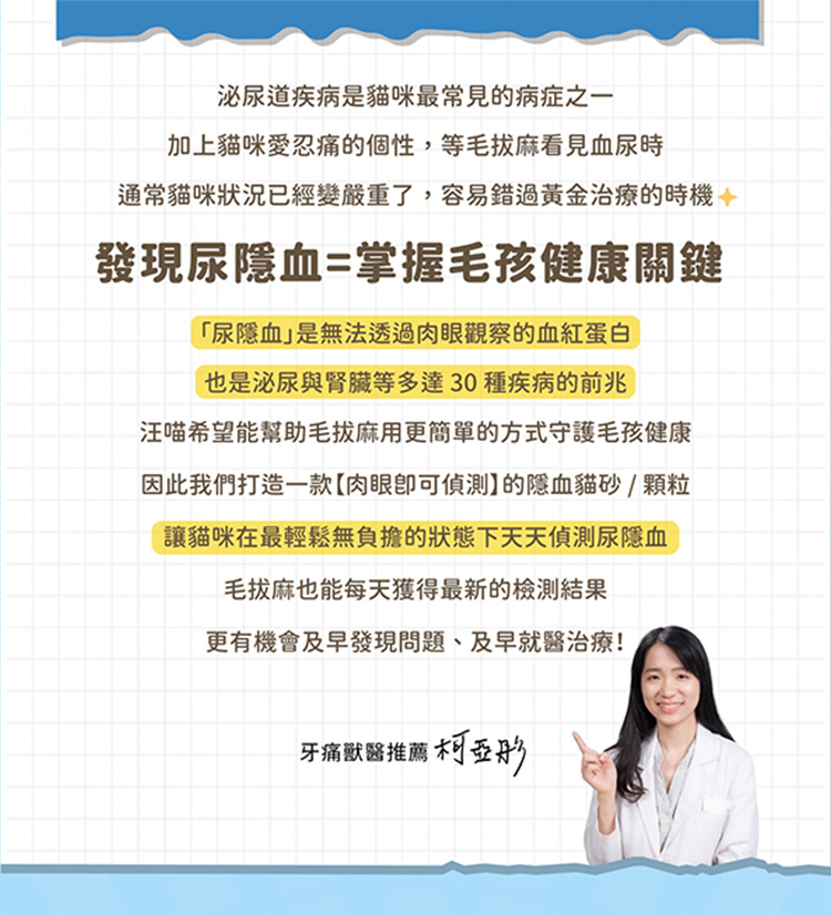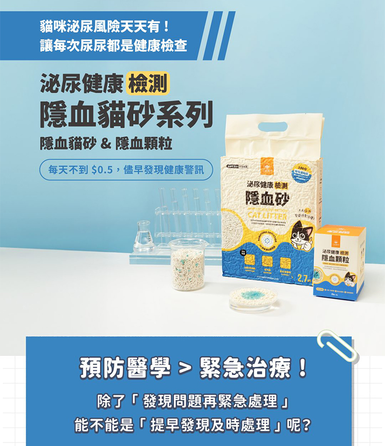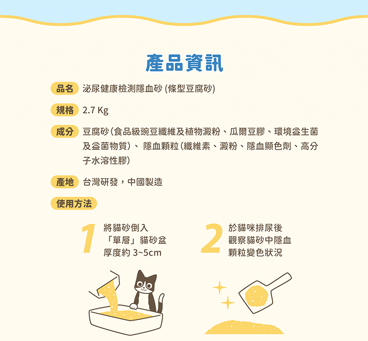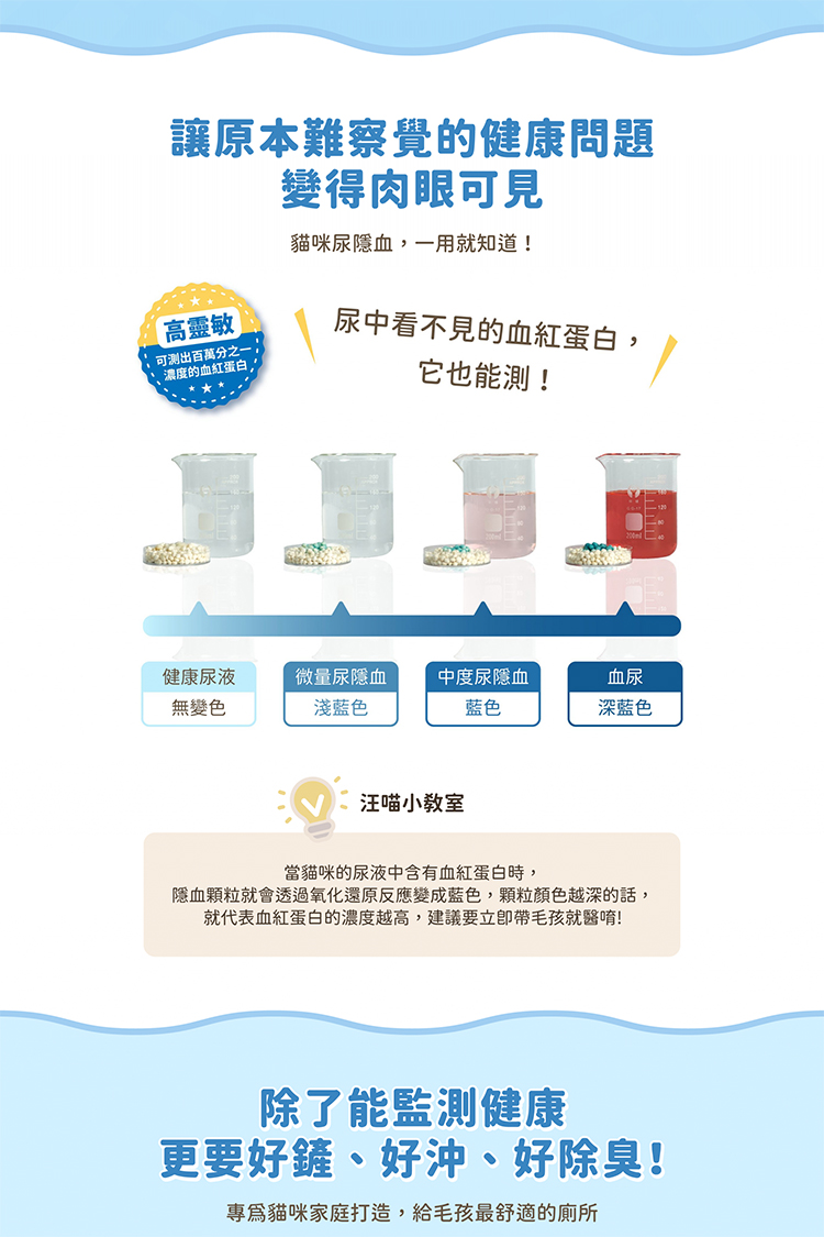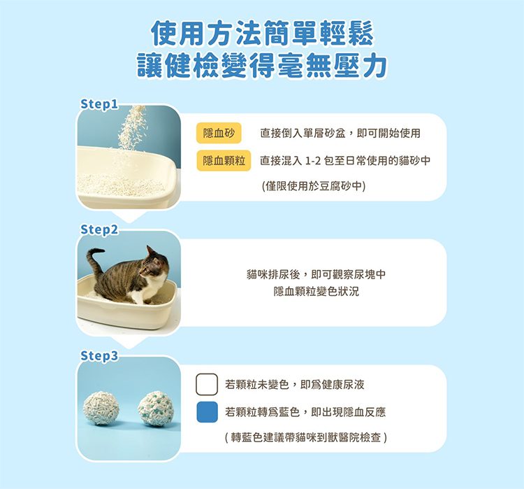 ※ 使用隱血貓砂時,不建議與除臭噴霧、除臭粉等產品一同使用,避免影響隱血顆粒判讀。