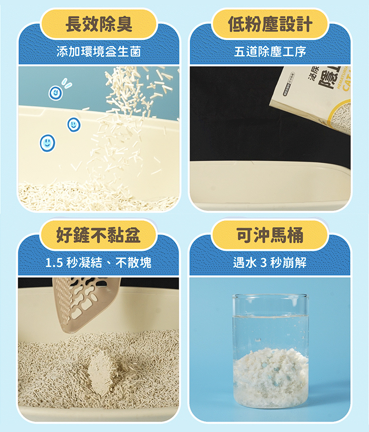 ※ 本產品為條型凝結砂,需搭配稍大孔徑貓砂鏟及單層貓砂盆使用。
